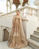 A three piece handworked beige bridal lehnga set featuring twinkling floral booti and stretched out vines on a glistening base of tissue.